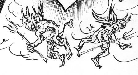 Zeichnung Dämonen: Otto Schaser * Jochen Klepper, 2. Strophe, Ambrosianischer Morgengesang – Schon bricht des Tages Glanz hervor, Nachdichtung von Jochen Klepper, in: Kyrie. Geistliche Lieder, 20. unver. Auflage 1998, Bielefeld 1950, 7 ** Einheitsübersetzung *** Evagrios Pontikos, Briefe aus der Wüste, 11. Brief, in: Weisungen der Väter Bd. 18, hrsg. v. Gabriel Bunge / Jakobus Kaffanke OSB, 2. verb. Auflage, Trier 2013, 188-189