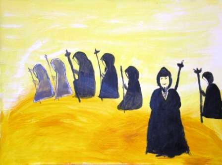 Demut bedeutet für mich: Die Wirklichkeit betrachten, sich so einzuschätzen, wie es der Wahrheit entspricht. Eine Reihe von Mönchen ist auf dem Weg durch die Wüste. Für den Hintergrund habe ich das helle, eher kalte Gelb genommen, um die Erschwernis einer solchen Wanderung durch die Wüste deutlich zu machen. Die ersten beiden Mönche links im Bild sind etwas verwischt dargestellt. Sie haben also mit Demut nicht viel am Hut, da sie nicht klar sind. Ein Mönch ist dem Betrachter zugewandt – er zeigt sich deutlich: Ja, das bin ich, so bin ich.