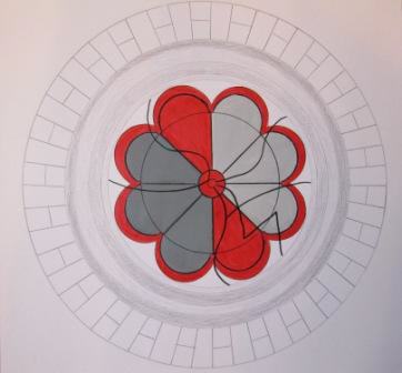 Mit Rat des Herzens ist für mich gemeint, sich von Gott und Menschen vertrauensvoll führen zu lassen! Es geht um wohlwollenden Rat, der erteilt wird und der dem anderen helfen soll. Dabei ist der ganze Mensch in den Blick zu nehmen. Die roten Anteile in der Rosette stehen für Leben und für göttlichen Rat. Die schwarzen Krakelstriche innerhalb der Rosette symbolisieren unsere Schattenseiten, Sünden und Laster.