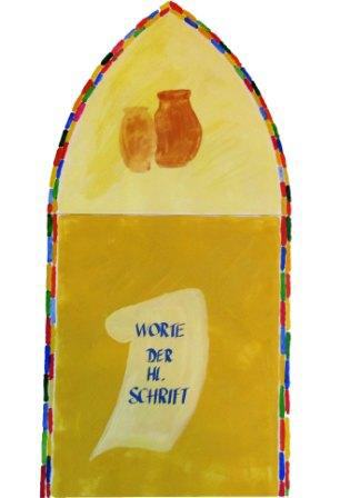 Ich habe mich an die Qumranschriften erinnert, die ältesten Handschriften der Bibel. Sie wurden in der Nähe des Toten Meeres entdeckt. Die Schriftrollen waren in Tongefäßen aufbewahrt worden. Intuitiv habe ich diese Idee in ein lichtes gotisches Fenster eingefasst, das nach oben strebt.