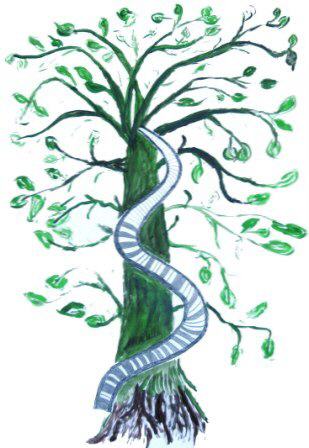 Als Zeichen der Selbsterkenntnis ist die Wendeltreppe zu sehen, einzelne Stufen habe ich dunkel gezeichnet, im Sinne von: seine Fehler, Schattenseiten, seine Sünden erkennen. Die Treppe windet sich um einen Baum, den Baum der Erkenntnis oder den Paradiesesbaum. Das Grün des Baumes symbolisiert das Wachsende, das Leben. Wollen wir nicht alle ins Paradies, und hoffen darauf?