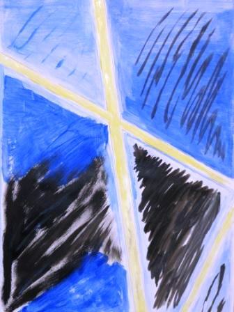 Die Kreuzesbalken habe ich bewusst in einem hellen Farbton gehalten, als Gegenpart zum Schwarz des Todes, zum Schrecken, zur Angst. Die helle Farbe ist mit etwas Gold unterlegt und soll versinnbildlichen, dass ich an ein Leben nach dem Tod glaube. Das dunkle Blau, das mit viel Schwarz versetzt ist, steht für meine Ängste vor dem Sterben, für die Todesangst – und für die Todessstunde, in der wir alleine sind.