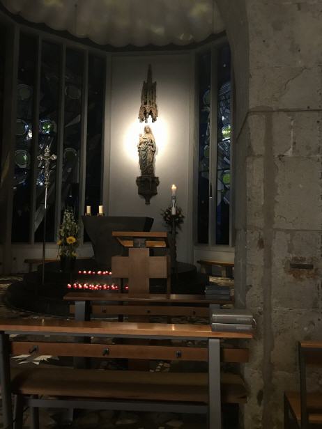 * Dietrich Bonhoeffer, Von guten Mächten treu und still umgeben, 5. Strophe; https://de.wikipedia.org/wiki/Von_guten_M%C3%A4chten_treu_und_still_umgeben#cite ** Weisung der Väter, übers. v. Bonifaz Miller, Trier 1986, 236. Foto: U. Manshausen Ort: Kapelle – Madonna in den Trümmern, Köln (Sommer 2017)