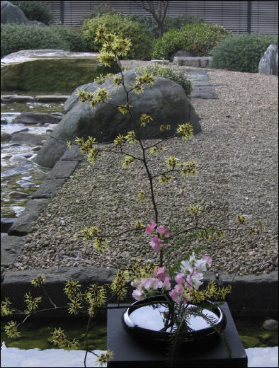 Die japanische Kunst des Blumenstellens ist eine kreative Möglichkeit, den Regungen der Seele Ausdruck zu verleihen. Sie schult das Auge für die Natur und deren Vielfalt. Strenge Stilisierungen formen nicht nur das handwerkliche Geschick, sondern leiten dazu an, die Natürlichkeit in das Vorgegebene zu integrieren. Die Meisterin, Frau Marion Schulz, greift liebevoll korrigierend ein. Es gehört mit zum Lernprozess, sich einfühlend auf die Veränderungen einzulassen. Die Vermittlung des Wissens bezieht nur zum Teil das reine Erkennen mit ein. Der Schwerpunkt liegt auf der Begegnung von Herz zu Herz, indem intuitiv neue Einsichten entstehen. Das Bild zeigt eine Landschaft, die eine Wasser- und eine Landseite hat. Dieses Arrangement ist bereits verblüht. Die Natur ist der Vergänglichkeit unterworfen, und immer wieder erneuert sie sich.